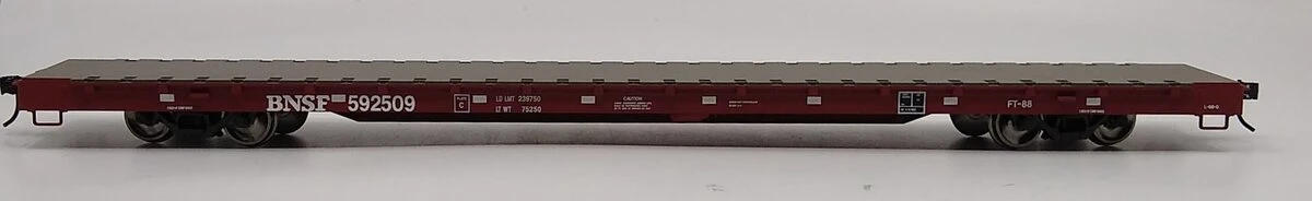 Here is an Atlas Trainman 20001591 Bulkhead Flat BNSF 592509. This product features a plastic body construction. This car features die-cast metal sprung trucks, operating knuckle couplers, metal wheels and axles.
