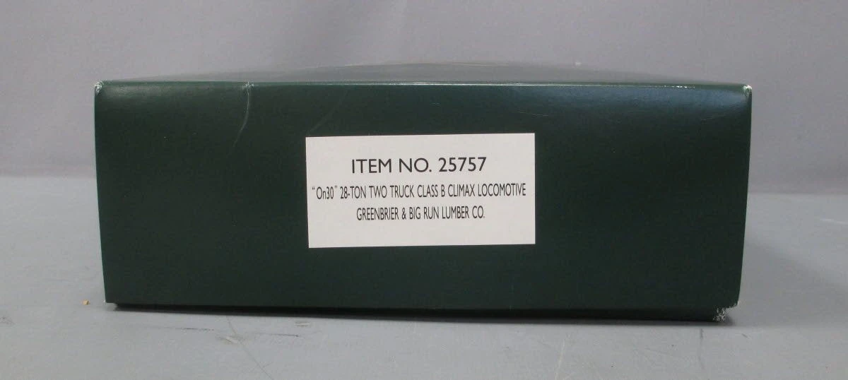 This is Bachmann Spectrum 25757 On30 Scale Greenbrier & Big Run Lumber 28 Ton 2-Truck Steam-Powered Class B Climax #6. These DCC-ready steam locomotives feature a five-pole skew-wound motor, center gearbox and a diecast frame, cab and boiler. Please see my pictures for additional features.