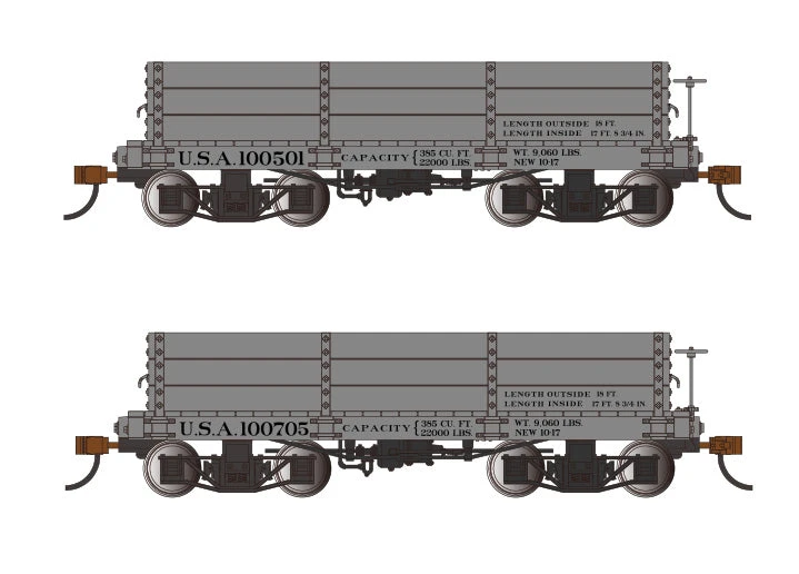 This is a Bachmann 26532 On30 USA 18′ Low Side Gondola Car Set #100501/100705 (Set of 2). Features: Spectrum quality – fully assembled rolling stock, 18′ prototypical design, Highly detailed body with separately applied parts, Performs best on 18 radius curves or greater, On30 Scale – O Scale narrow-gauge model that runs on HO track, Product Measurements: L 10.75 in., W 1.75 in., H 1.5 in., Retail Package Measurements: L 12 in., W 3 in., H 5.2 in.