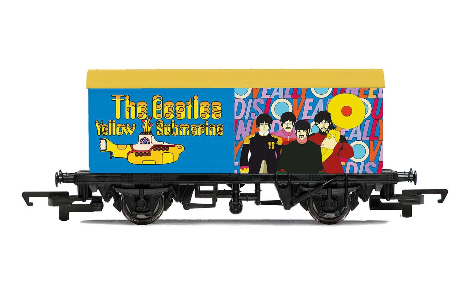 This is a Hornby R60010 OO The Beatles Yellow Submarine Wagon. Magical Mystery Tour’ was a record by The Beatles released as a double EP at the end of 1967. As well as including much loved songs such as ‘Magical Mystery Tour’ and ‘I Am the Walrus’, the record served as the soundtrack to the television film of the same name. The album is celebrated by Hornby on this goods van featuring specially designed artwork inspired by the album.