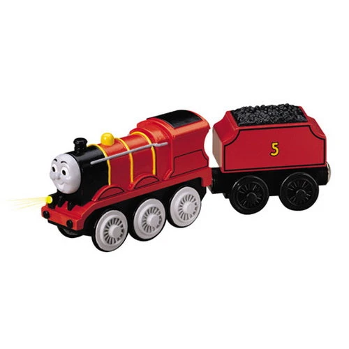 The James die-cast battery-powered engine features powerful four-wheel drive, easy start button, light, and realistic detail. Includes tender. Requires one AA battery (not included). Thomas Wooden Railway vehicles, track and destinations are not compatible with Take Along Thomas items.