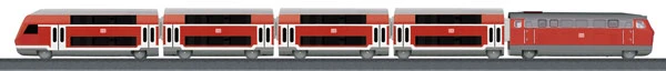 This is a Marklin 29209 HO Scale Regional Express Battery Operated Starter Set w/Plastic Track – My World German Federal Railroad DB Lights, sound, action. This set is fun for everyone. The five-part train set includes a permanently coupled motorized diesel locomotive attached to a bi-level passenger car with built-in battery holder. The train has three speed levels in both forward and reverse plus three sound functions and triple headlights. Magnet couplers, a sturdy plastic track layout and an infrared controller make it easy to set up and run. Batteries are included.