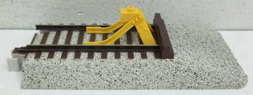 Here is a S-Helper 00926 S Scale 5 inch Straight Track End Section with Non-Illuminated Bumper. This track section features a plastic simulated gravel roadbed with brown crossties, metal rails, and a plastic yellow bumper.