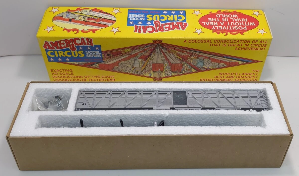 This is a Walthers 49 HO American Circus Series Royal American Stock Car Kit #49. This car kit features plastic components, plastic trucks, operating knuckle couplers, plastic wheels and metal axles.