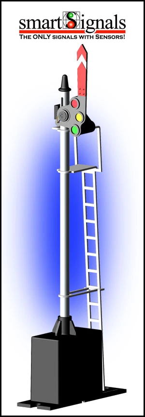 This is a Z-Stuff 1040S S-Gauge Semaphore – Upper Quadrant. With metal poles and ladders, these scale signals will look great along your right-of-way. The 3-position flag has a realistic slow motion. The base has optical sensors built-in with a sensitivity adjustment. Just apply power and put them next to the track. These signals do the rest. When the train is sensed next to the motor moves the signal to the stop condition and shows RED. No power is on the motor in each position. Four (4) seconds after the train passes, the signal changes to caution showing YELLOW. After three (3) more seconds the signal returns to clear showing GREEN. They have separate inputs and outputs so they can be daisy chained. The down track signal will hold the up track signal on yellow until the down track signal goes off red. Features: • Scale size and realistic operation • Digital crossing bell sound • Optical train detection (no cutting of rails required) • Handles up to four tracks • Realistic, long-life, red and green LED signals.